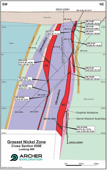 Jack Gauthier, VP Exploration, commented: “Despite challenging drilling conditions, we are pleased with the progress we've made at Grasset. Our first two holes of the winter program were highly encouraging, particularly at depth below the current resource. GR23-02 intersected more than 3m (true thickness) of barren massive sulphides at a depth of 795m and only 35m away from the deepest high-grade nickel intercept to date. While mostly pyrite with trace pyrrhotite, volcanogenic sulphides are an essential element in the metallogenetic model for the formation of high-grade nickel magmatic sulphides. These results provide further evidence of the potential to expand the nickel resource at Grasset and validate our targeting approach."