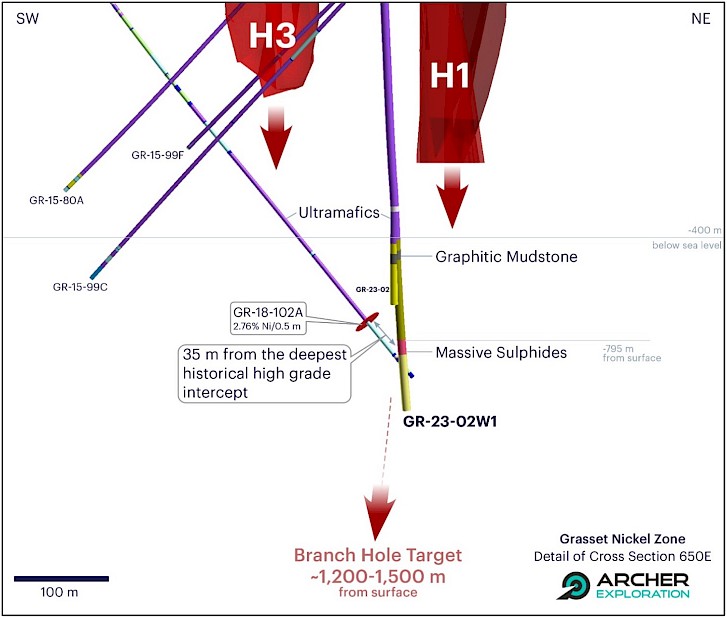 A second pilot hole, GR23-02, was collared 130m southeast of GR23-01 with an 87-degree dip and a northwest azimuth, aligned to favour the natural deviation tendencies within the softer rock units (Figure 2). As with GR23-01, the objective of GR23-02 was to target potential zones of high-grade nickel mineralization beneath the thickest, richest part of the current mineral resource. In addition, GR23-02 was also targeting a potential extension of H1, 70m below the deepest mineralized intersection to date, which is approximately 775m below the surface (GR18-102A: 2.76% Ni over 0.51m within 0.41% Ni over 14.15m).