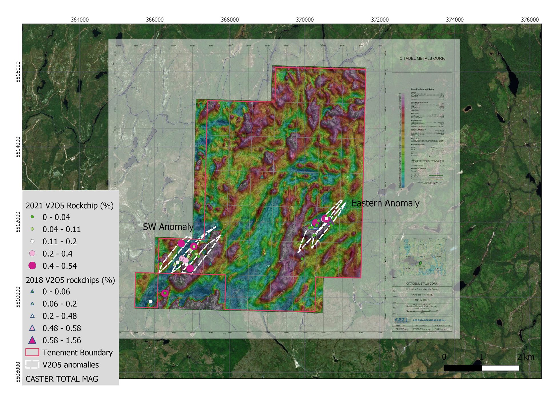 Figure 1: Rockchip sampling location, V2O5 geochemistry and interpreted mineralised lenses over aeromagnetic survey (total magnetic intensity). Two mineralised zones identified to date identified as SW Anomaly and Eastern Anomaly.