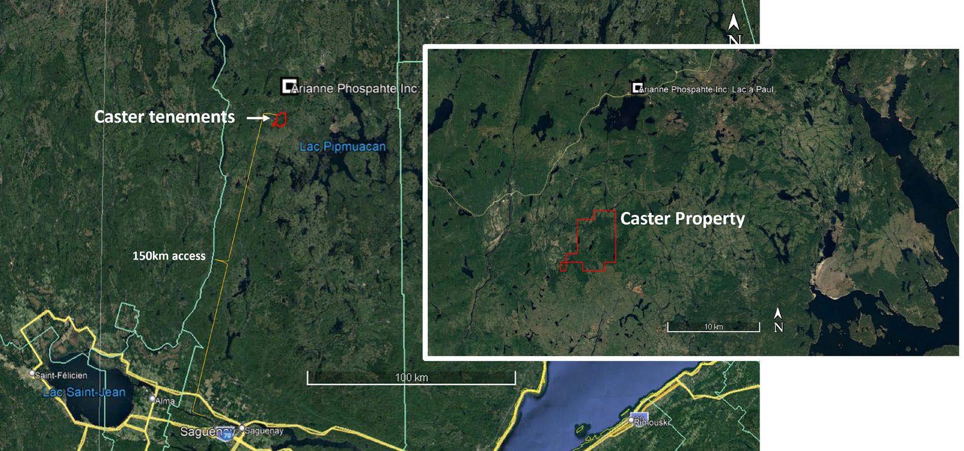 Figure 2: Location of Caster Property, some 150km north of sea-port town of Saguenay. Immediately south of Lac Paul Phosphate project, which is in advanced development stage by Arianne Phosphate Inc.