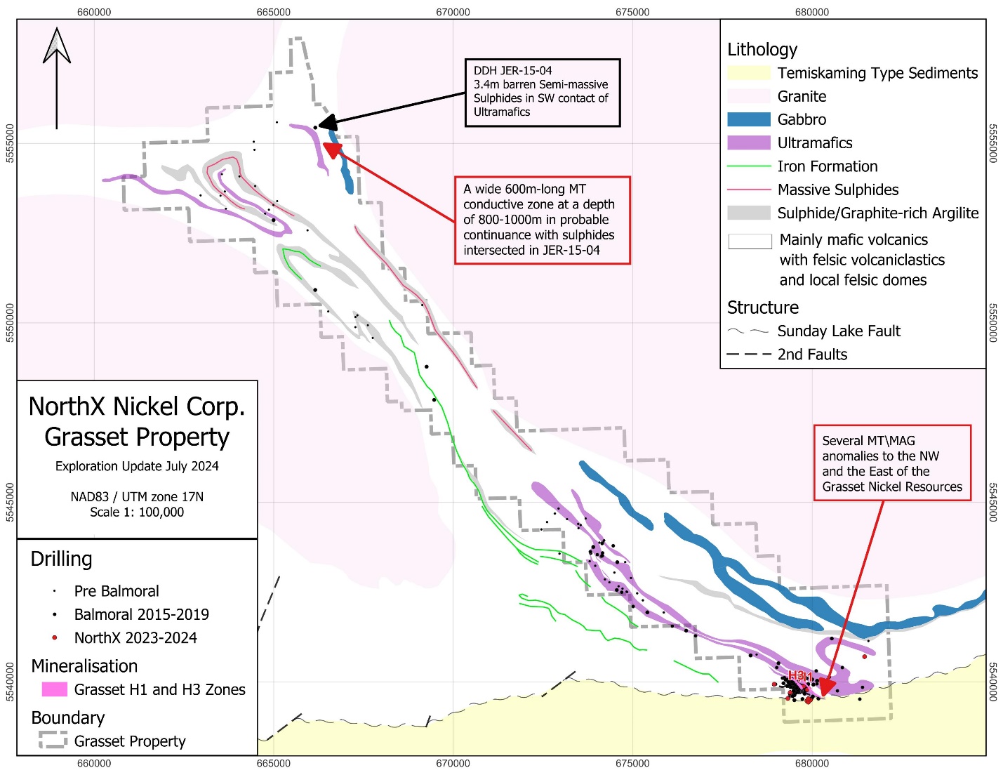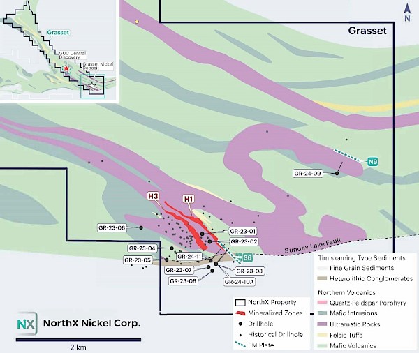 Figure 1: Geological Plan of the Southeastern Portion of the Grasset Property Showing the Location of 2023-2024 Drilling by NorthX Nickel Corp.