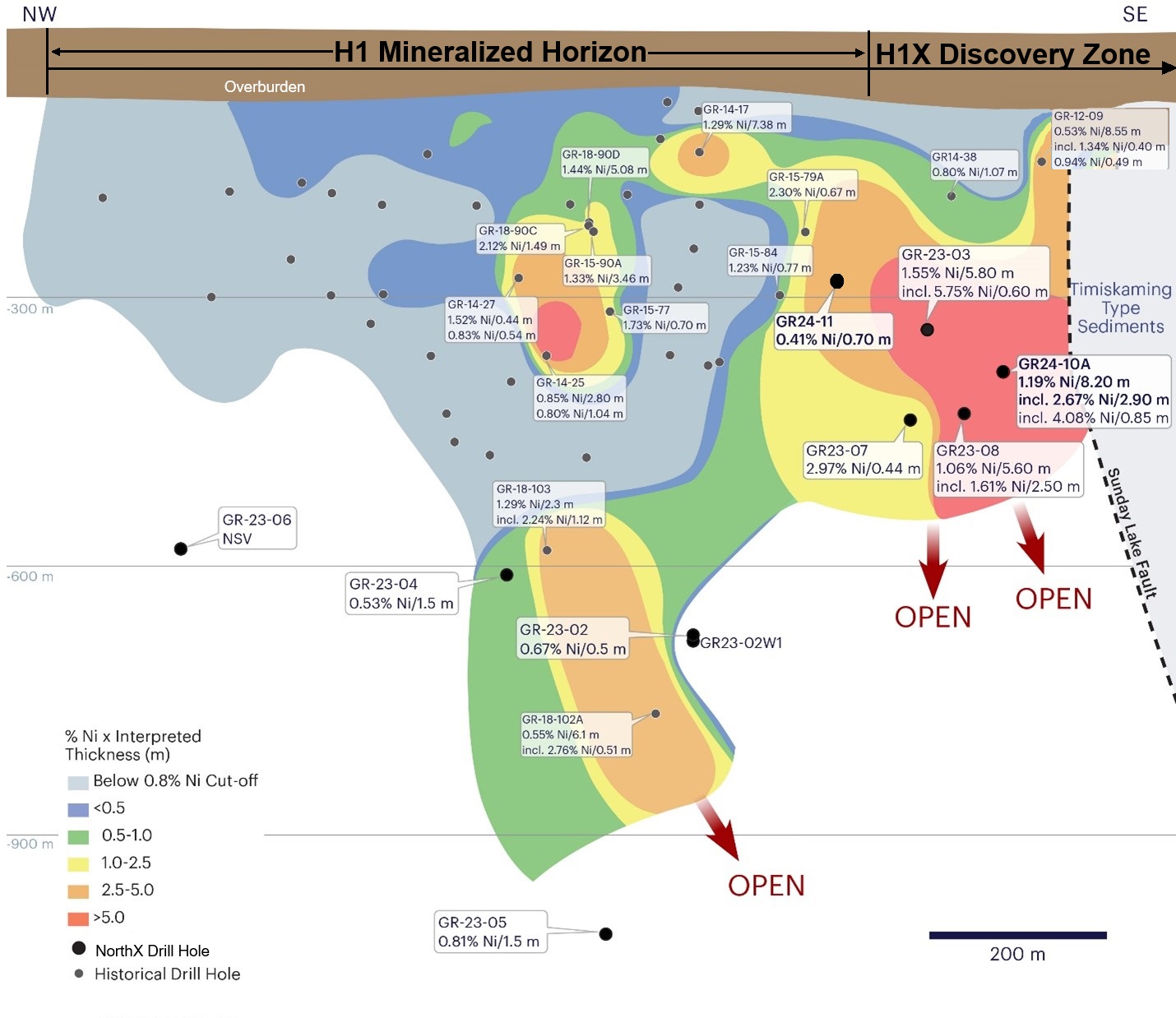 The H1X Discovery Zone starts at a depth of 300 metres and is less than 500 metres east of the Grasset deposit (5.5 MT @ 1.53% NiEq). The mineralization within the H1X Zone consists of thicker net-textured and/or disseminated sulphide zones with thin basal massive sulphide intervals that may thicken towards the central part of the interpreted channel structure. TheH1X Zone is open at depth and laterally for at least 500 metres. In many respects the H1X Zone closely reflects the H3 Horizon which hosts most of the current resource, suggesting ample room for additional nickel mineralization in this zone. (All results were previously disclosed in a press release dated March 22, 2024).