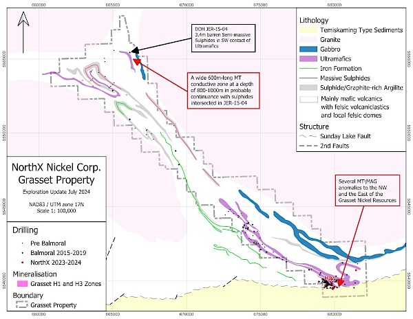 VANCOUVER, BC, July 8, 2024 – NorthX Nickel Corp. (CSE: NIX) (OTCQB: NXNIF) (FSE: 6YR) (the “Company” or “NorthX”) is pleased to provide a summary of the drilling completed and an update on the latest geophysics results for work completed through our 2023-2024 exploration program at its 100%-owned Grasset Ni-Cu-PGE Project (“Grasset”) in the Abitibi Greenstone Belt of Quebec, Canada.