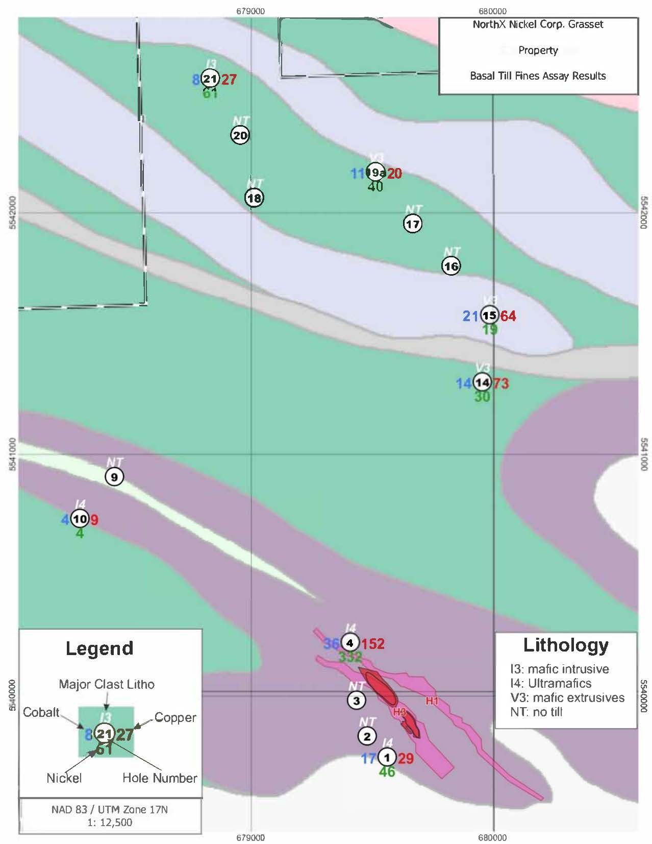 The Grasset property is an underexplored 23-kilometre-long belt containing abundant favorable ultramafic host rocks but without outcrop. Quaternary glacial overburden is 50 to 90 metres thick in the southeastern half of the property, and 20 to 50 metres in the northwestern half. Such thick glacial overburden renders the Grasset deposit and other potential mineralization blind to conventional surface geochemical sampling techniques. A 15-hole orientation sonic drill program was therefore performed in 2023 to sample both the basal till, and 2-3 metres of solid bedrock below the overburden. Geochemical anomalies in the basal till can indicate the proximity to bedrock mineralization. This technique is commonly used with success in exploration campaigns for detecting mineral deposits under thick glacial overburden.